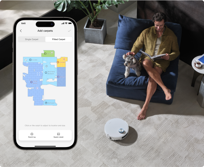 * Mattojen tehokkaampi imu: Toiminto on valittavissa siivoussovelluksessa. Maton havaitessaan robotti-imuri ottaa käyttöön enimmäisimutehon. Ei käytettävissä hiljaisessa imutilassa.