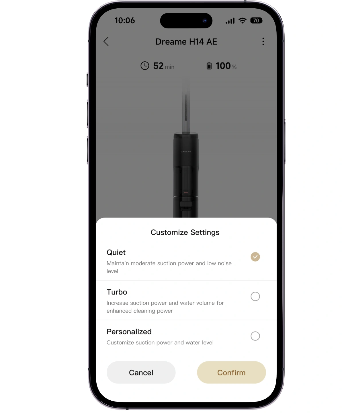 * Ominaisuutta ei suositella matoille, joiden korkeus on yli 3 cm, sillä korkeammat matot saattavat kastua. Pitkänukkaisille ja keskipitkänukkaisille matoille tarkoitetut puhdistusasetukset on otettava käyttöön manuaalisesti sovelluksesta.