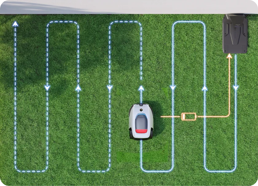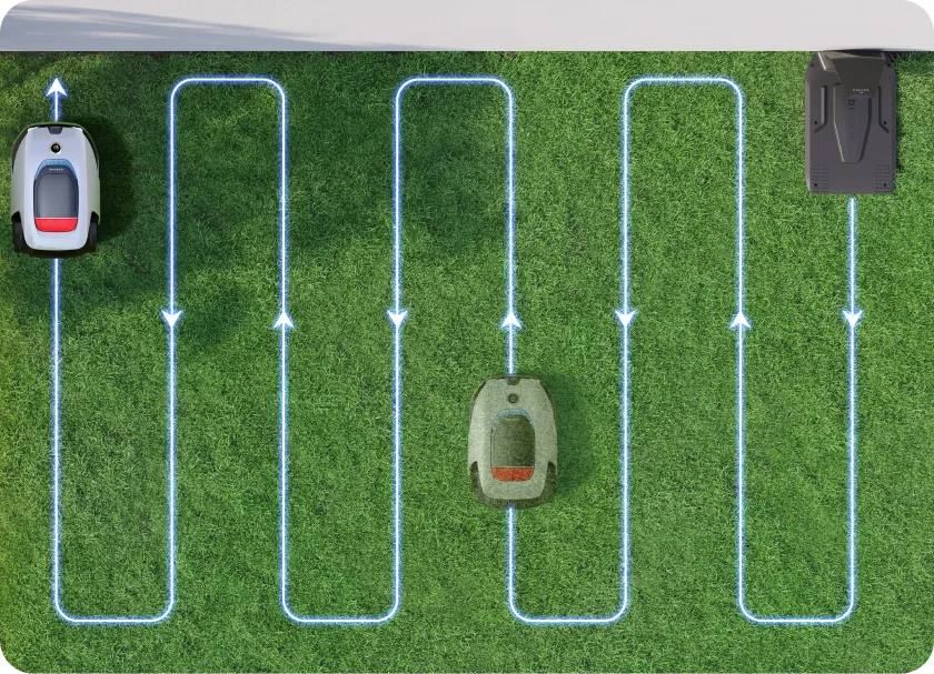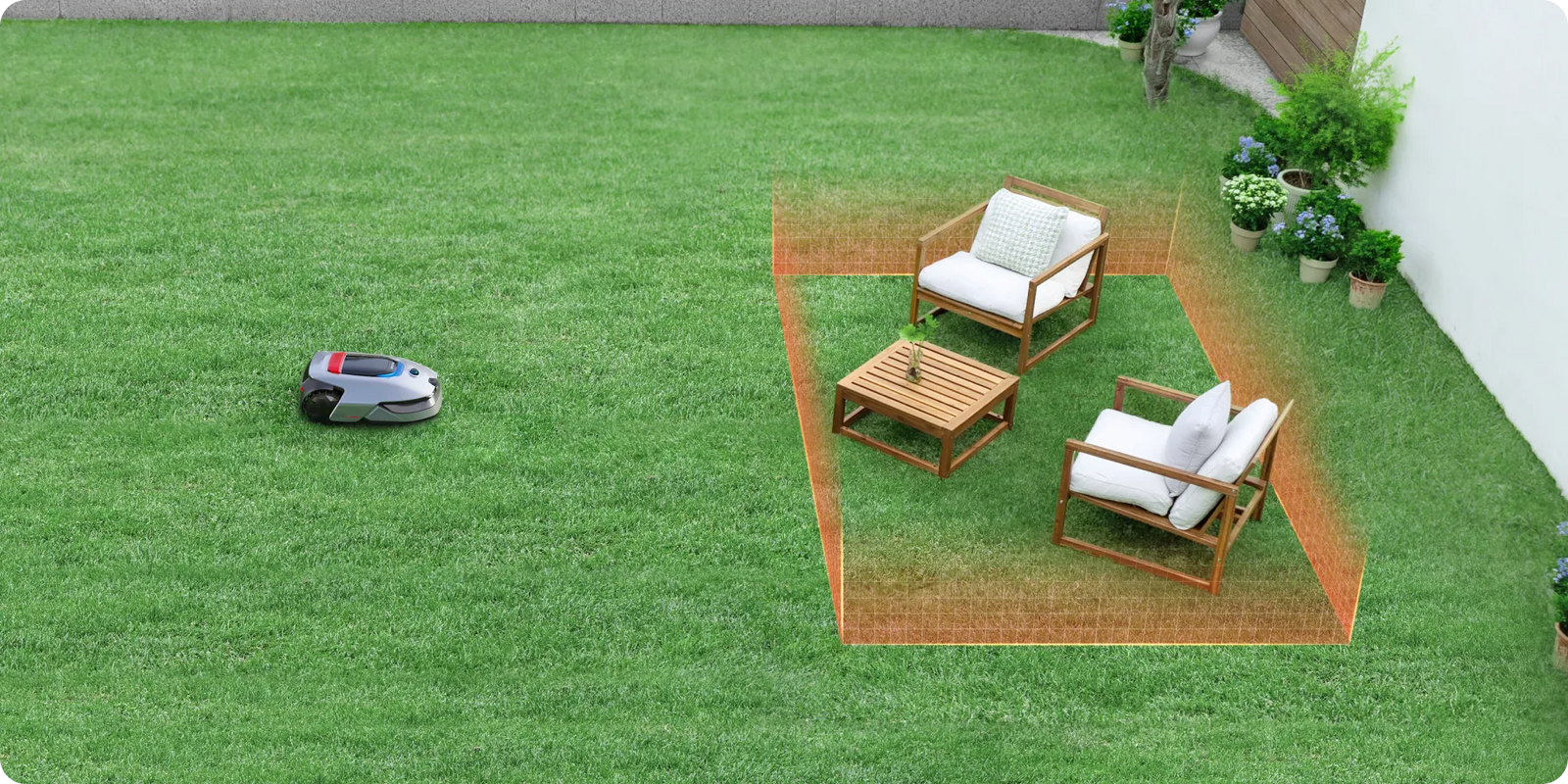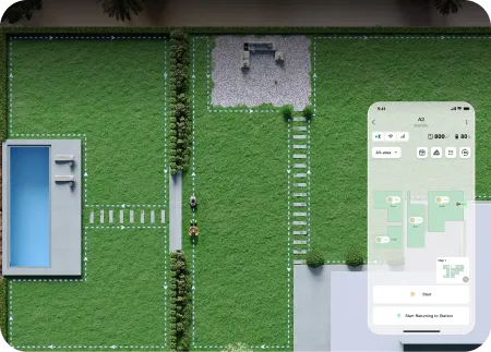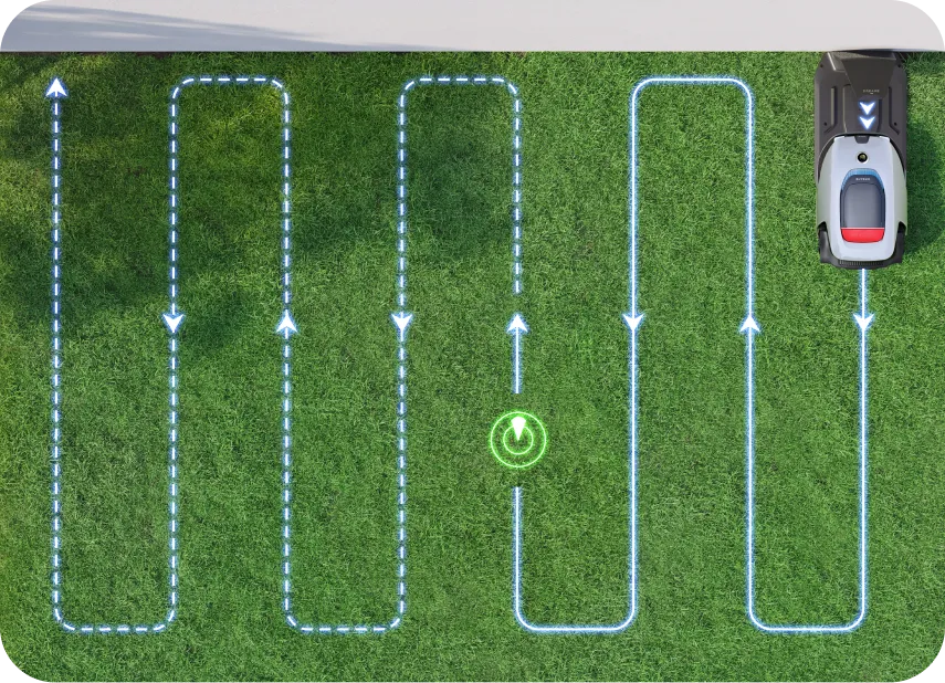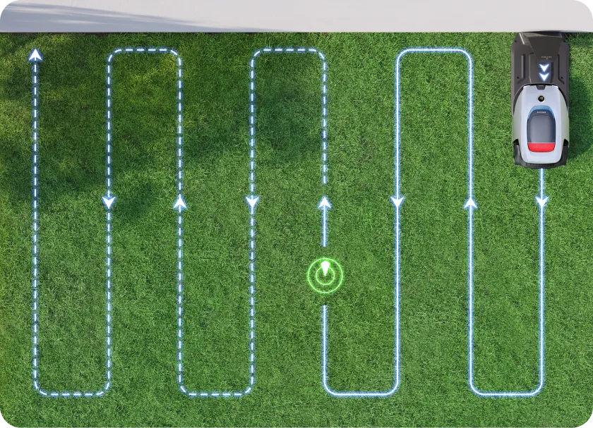 * Automaattinen rajojen määrittäminen koskee vain pihoja, joilla on selkeät nurmikon rajat. Ohjaa ruohonleikkuri kaukosäätimellä ensin nurmikon reunoille. Aktivoi sitten automaattinen rajojen tunnistustila. Monimutkaiset puutarhat, joissa on epäselvät nurmikon reunat, vaativat manuaalisen ohjauksen koko kartoitusta varten.