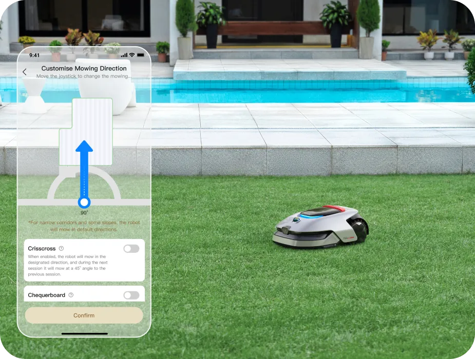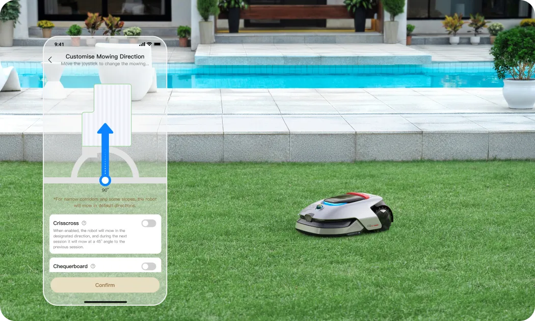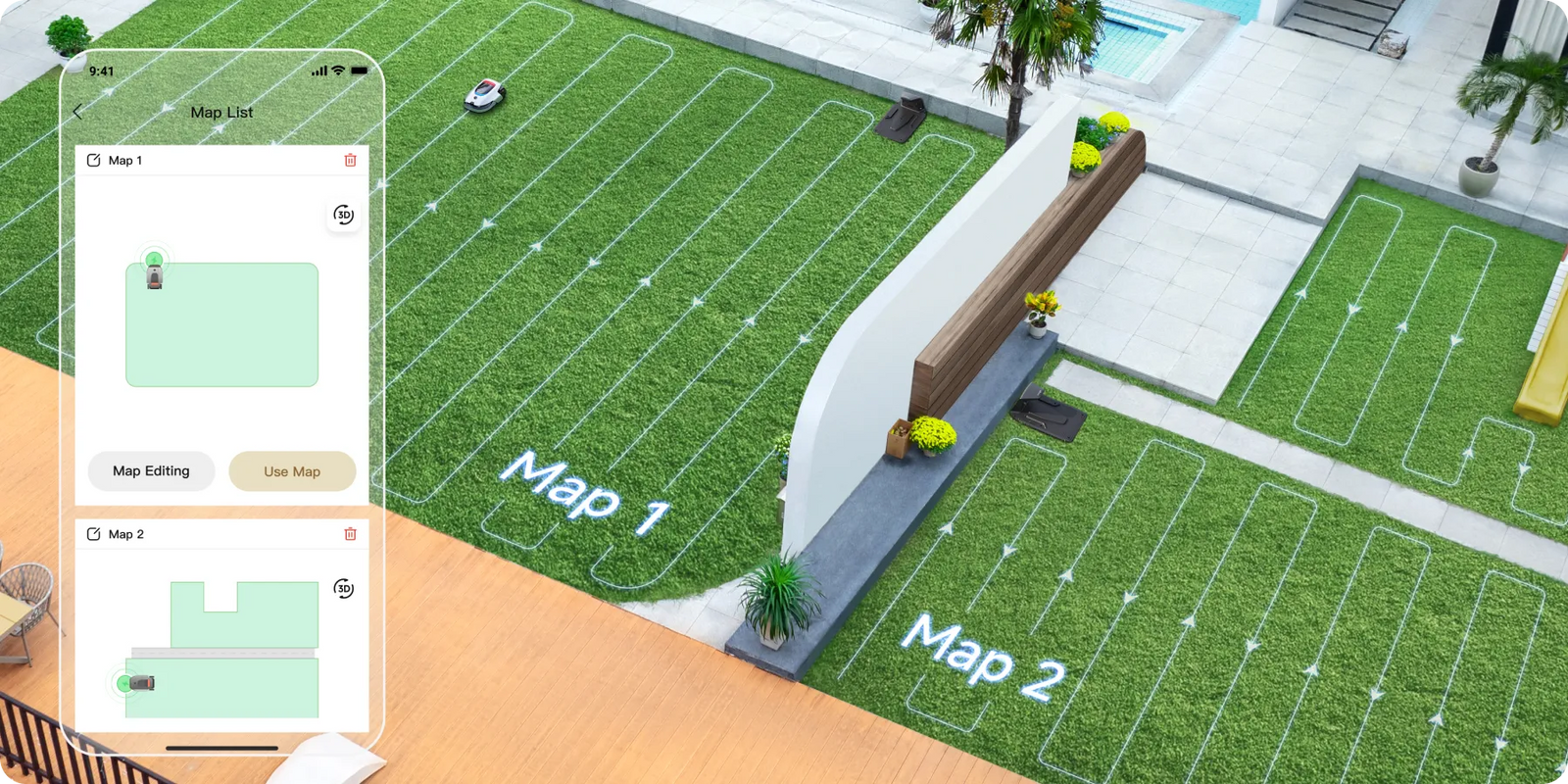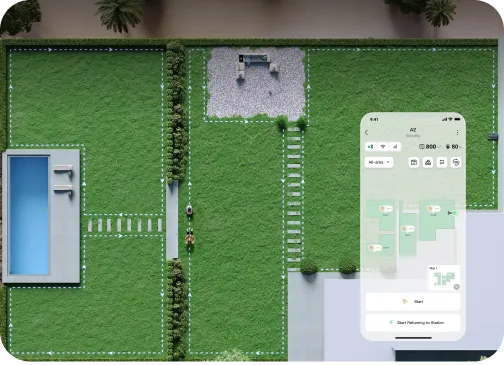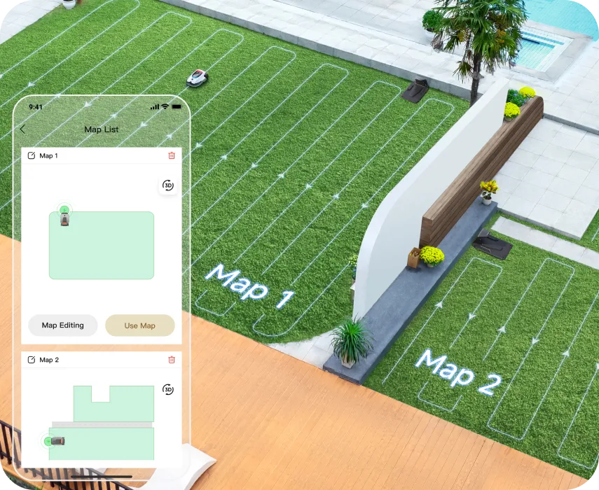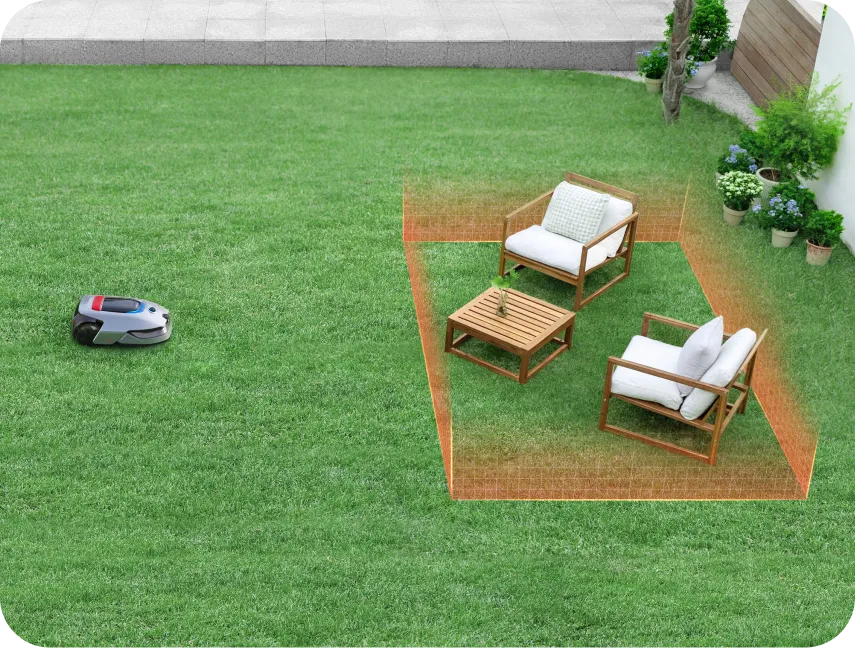 * Automaattinen rajojen määrittäminen koskee vain pihoja, joilla on selkeät nurmikon rajat. Ohjaa ruohonleikkuri kaukosäätimellä ensin nurmikon reunoille. Aktivoi sitten automaattinen rajojen tunnistustila. Monimutkaiset puutarhat, joissa on epäselvät nurmikon reunat, vaativat manuaalisen ohjauksen koko kartoitusta varten.