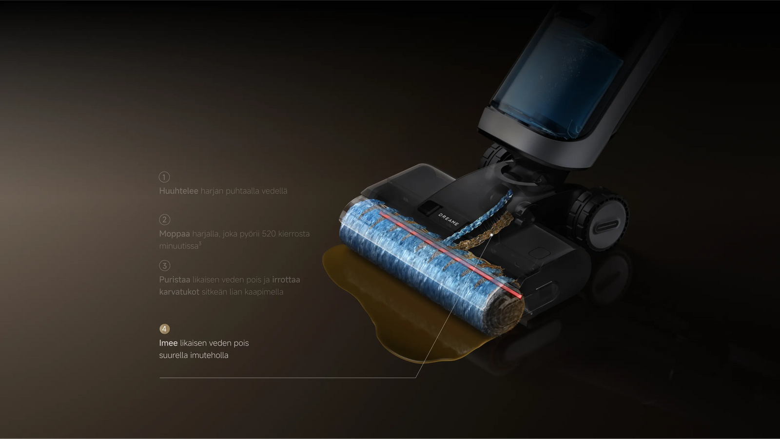 ¹² Täysin kuiva harja: Kun täysin märkä harja asetetaan normaalin käytön jälkeen pohjatilaan itsepuhdistusta varten, harja on oman laboratoriomme datan perusteella kuivausjakson päätyttyä täysin kuiva. Raporttinro: ZMX-240625-009-4