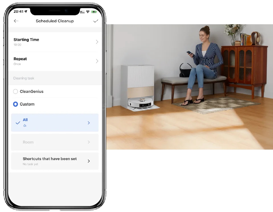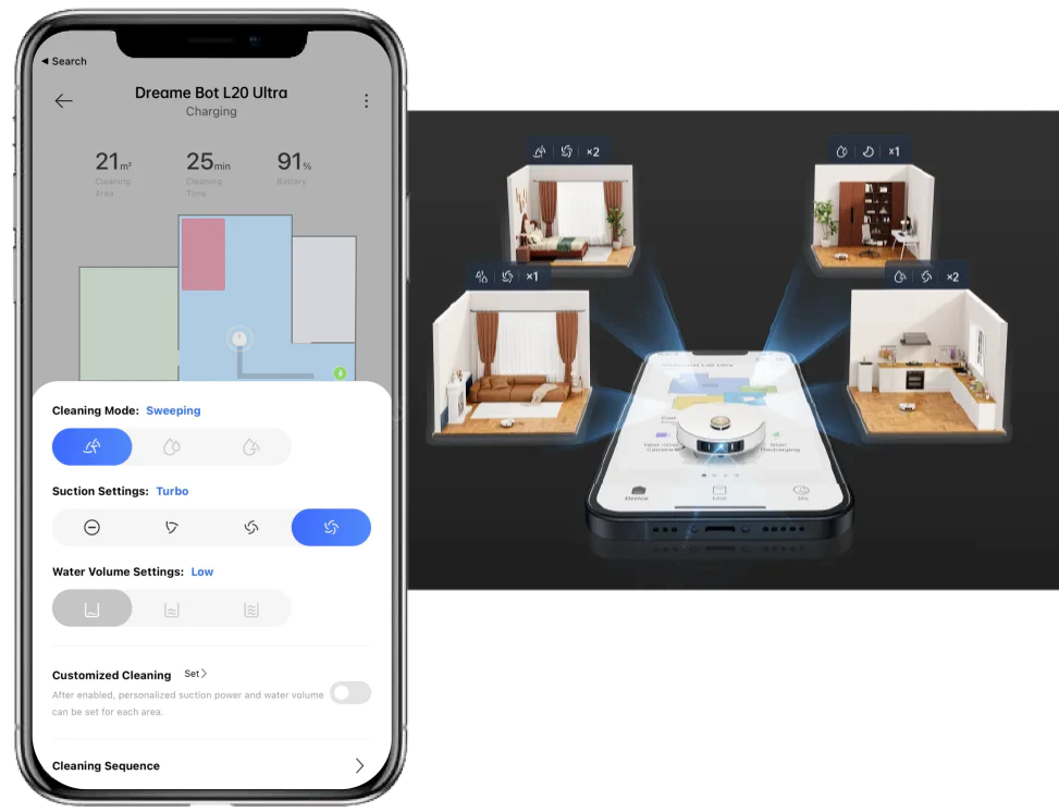 Saat parhaan DreameHome-kokemuksen, kun lataat uuden sovelluksen App Storesta tai Google Playsta.Sovelluksen avulla voit mukauttaa siivouksen kotiisi ja aikatauluusi sopivaksi.Segmentoi huoneita, luo virtuaaliseiniä, määritä kieltoalueita ja ajoita siivous – kaikki tämä kätevästi omasta puhelimestasi käsin.