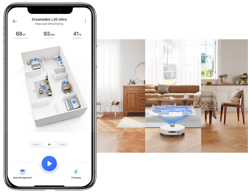 Älykkäiden algoritmien avulla L20 Ultra oppii tuntemaan myös monimutkaiset kotiympäristöt, jotta se tietää milloin sen pitää pidentää moppeja ja milloin vetää ne sisään.
