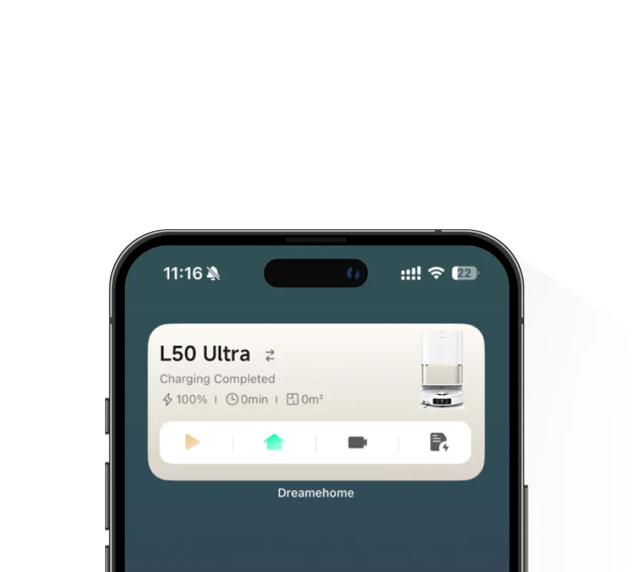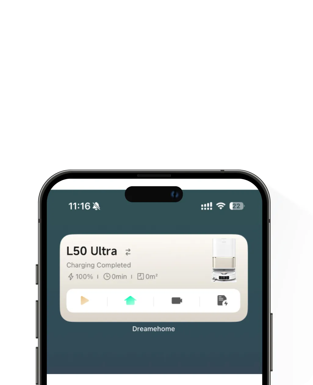 L50 Ultran 6 400 mAh:n akku mahdollistaa jopa 200 minuuttia* siivousta hiljaisessa tilassa, ja se pystyy siivoamaan jopa 186 m²:n* alueen yhdellä latauksella. Kun akun varaustila on alhainen, imuri palaa latausasemaan ladattavaksi ja jatkaa sen jälkeen siivousta siitä, mihin se jäi. Hyödynnä 30 % nopeampi* lataus ja mahdollisuus aikatauluttaa lataus sähkön hintavaihteluiden mukaan.