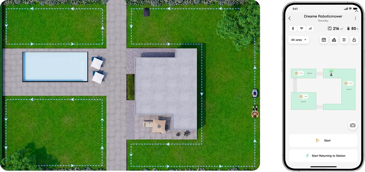 3D-pistepilviteknologian ja edistyksellisten tekoälyalgoritmien avulla A1-robottiruohonleikkuri tunnistaa ja kiertää esteet älykkäästi sille asetettujen rajojen mukaisesti. Näin ruohonleikkuu sujuu turvallisesti ja hallitusti.