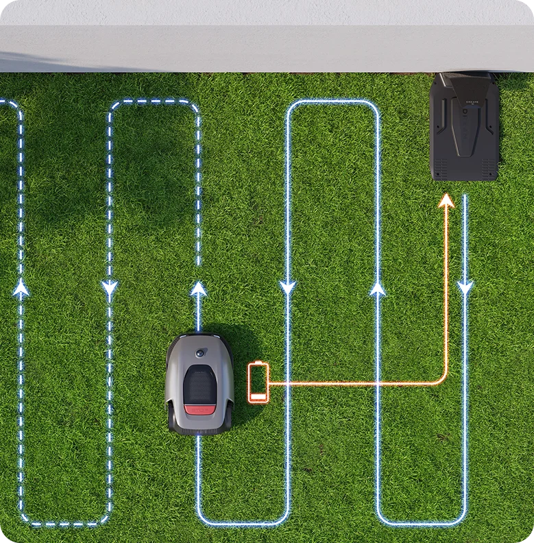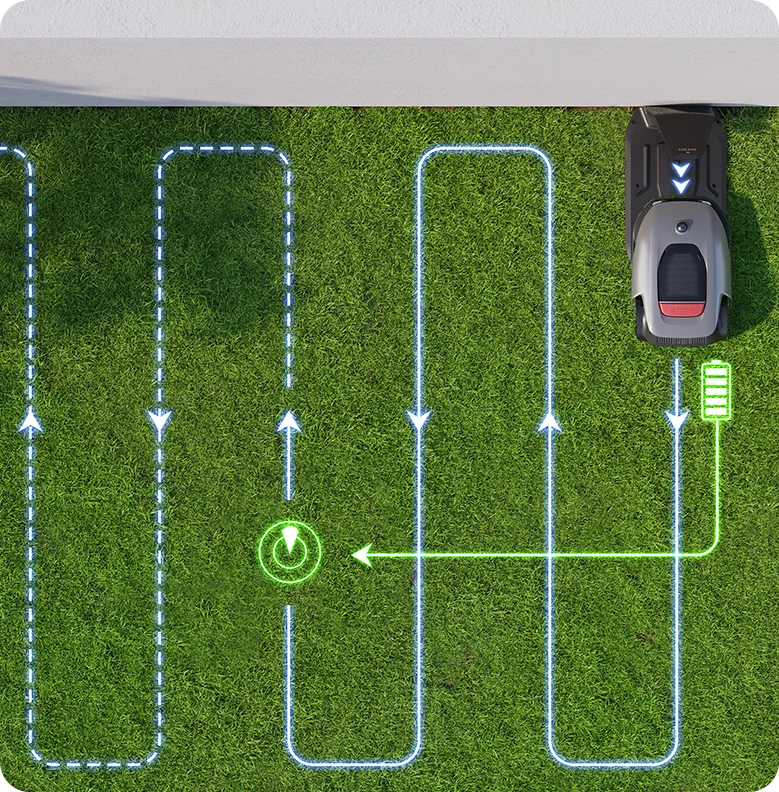 A1-robottiruohonleikkuri lataa itse itsensä, joten sinun ei tarvitse huolehtia alhaisesta akun varaustasosta. Kun akun varaustaso on alle 15 %, älykäs robottiruohonleikkuri palaa automaattisesti latausasemaansa ja jatkaa työtään latauduttuaan täysin, minkä ansiosta se sopii erityisen hyvin laaja-alaisille pihoille.