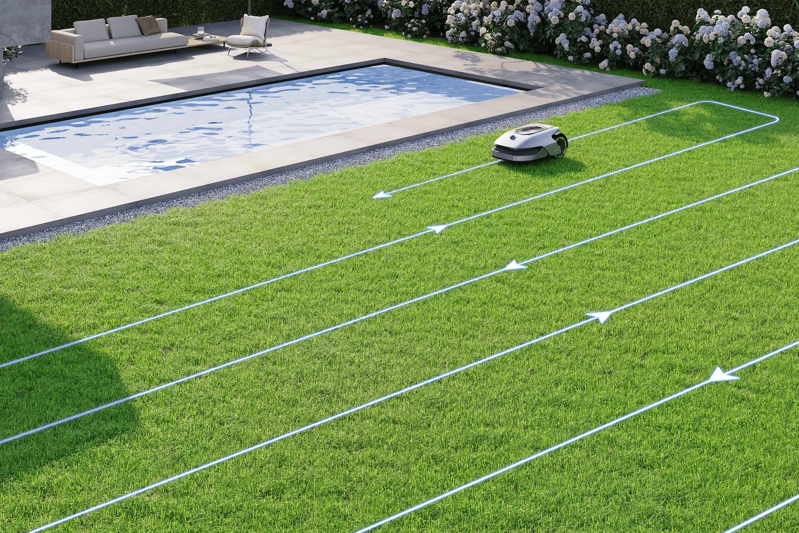 A1-robottiruohonleikkuri kulkee U-kirjaimen muotoisissa riveissä, minkä ansiosta se pystyy käsittelemään koko nurmikon helposti. Tuloksena on upean tasainen ja laadukas leikkuutulos. Leikkaa laajat, jopa 1 000 m²:n nurmikot vain 24 tunnissa.5